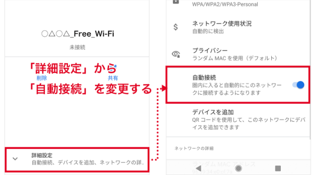 また、一度Wi-Fiを自身で切断すると、次にWi-Fiをオンにしても一定時間自動では接続しない端末もあります。Android