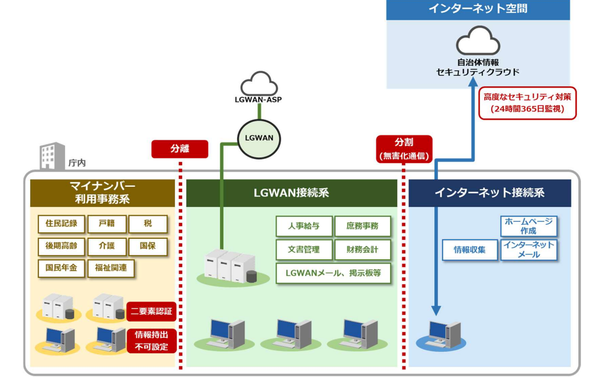 総務省の「地方公共団体における情報セキュリティポリシーに関するガイドライン(令和7年3月版)」では、「マイナンバー利用事務系」「LGWAN接続系」「インターネット接続系」のいずれについても、一定のセキュリティ対策を講じることを前提に無線LANの利用が認められています。