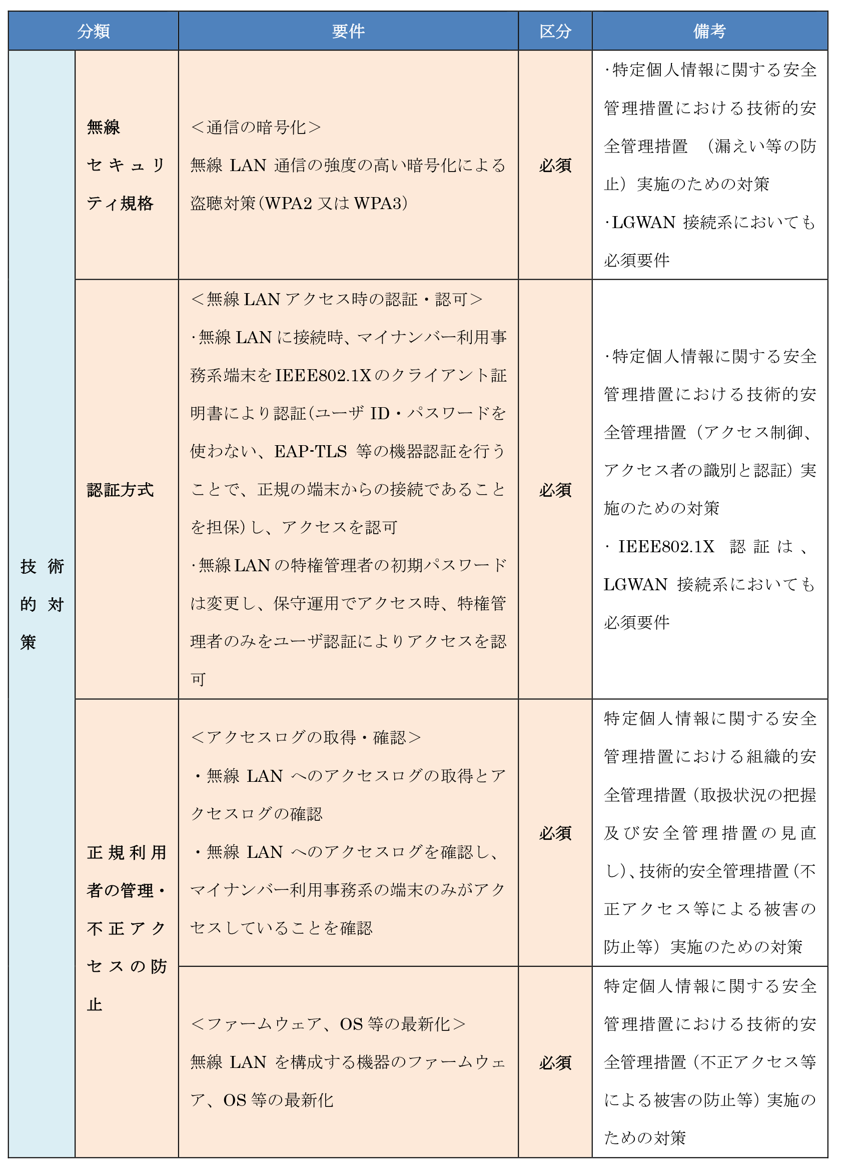 マイナンバー利用事務系での無線 LAN 利用の要件(抜粋)出典:総務省「地方公共団体における情報セキュリティポリシーに関するガイドライン(令和7年3月版)」より
